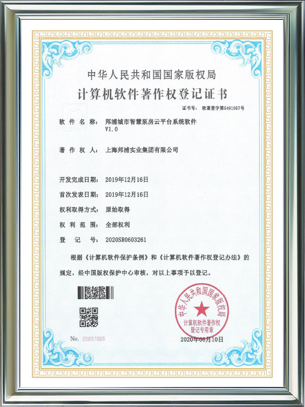 Certificado de registro de obras de software de computador Bangpu City Smart Pump Room Cloud Platform System Software