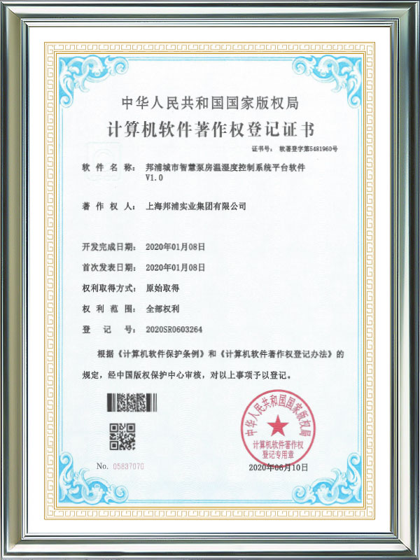 Certificado de registro de obras de software de computador Bangpu City Smart Pump Room Software de plataforma de controle de temperatura e umidade V1.0